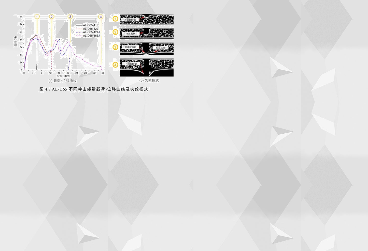 從圖4.3中AL-D65在166J沖擊能量下的載荷-位移曲線可以看出,其曲線有三個峰值載荷,結合各沖擊能量下的失效模式可以看出,AL-D65與AL-F2的失效機理有一定程度的相似性,兩者均是由于上面板裂紋的出現導致第一次峰值載荷下降以及下面板裂紋的出現導致最后一次峰值載荷下降,并且都由于泡沫芯層的密實化導致載荷在第一次波谷后繼續(xù)上升;而不同之處在于,AL-D65的下面板與膠層之間出現失效分離,如圖4.3(b)中③所示,再結合AL-D65的載荷-位移曲線可以看到,②與③之間存在一個峰值載荷,而導致AL-D65第二個峰值載荷下降的原因是由于下面板與膠層之間出現失效分離。