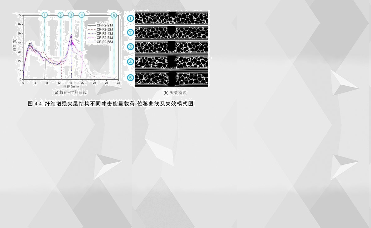 通過分析發(fā)現(xiàn),碳纖維夾層結(jié)構(gòu)和玻璃纖維夾層結(jié)構(gòu)的具備相似的沖擊失效機(jī)理,以CF-F2為例,通過其在不同沖擊速度下得到的載荷-位移曲線對(duì)比來看,如圖4.4(a)所示,當(dāng)前速度范圍的應(yīng)變率對(duì)此纖維增強(qiáng)夾層結(jié)構(gòu)的機(jī)械響應(yīng)影響不大,所以亦可以用不同沖擊速度下的試件最終破壞形式來分析其損傷失效機(jī)理,這與鋁合金夾層結(jié)構(gòu)的分析方法類似。通過觀察發(fā)現(xiàn),CF-F2的載荷-位移曲線和失效過程與AL-F2有很大地相似性,均存在兩個(gè)峰值載荷并且未出現(xiàn)面板與膠層失效分離。與AL-F2不同的是,由于CF-F2面板為脆性材料,其載荷達(dá)到第一次峰值載荷的位移要比AL-F2的小許多,并且CF-F2在第一階段的曲線更加接近線性增長(zhǎng);此外,前者在兩峰值載荷下降位置處,面板發(fā)生塑性斷裂,而后者發(fā)生脆性斷裂;由于兩者的第二階段皆以上下面板斷裂為界,所以此階段主要以泡沫芯層壓潰與芯層剪切吸能沖擊能量,通過對(duì)比兩者的第二階段,發(fā)現(xiàn)此階段兩者的位移長(zhǎng)度基本一致。需要特別注意的是,由于CF-F2的下面板的破壞區(qū)域位置比上面板的更大,如圖4.4(b)所示,其第二峰值載荷甚至比第一峰值載荷更高。