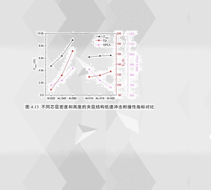 根據(jù)各配置的試件在穿透能沖擊下的載荷-位移曲線,計算得出各耐撞性指標比較如圖4.13所示,可以看出,隨著夾層結(jié)構(gòu)芯層密度的上升,其耐撞性能明顯提高,芯層密度從0.25g/cm3增加到0.65g/cm3,夾層結(jié)構(gòu)的初始峰值載荷增加89%,穿透吸能提高82%,比穿透能提高23%;對芯層高度而言,試件的芯層高度從10mm增加到20mm,其初始峰值載荷和穿透吸能均只有小幅增加,特別是初始峰值載荷,增加的幅度基本忽略不計,而其比穿透能反而明顯降低,大約下降了25%。